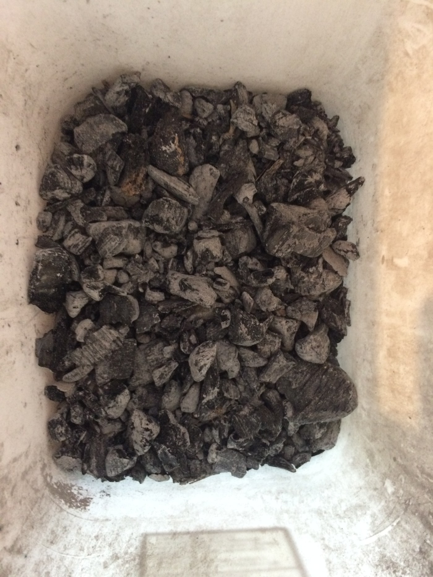 I cleaned our fireplace today, and emptied the ash catchment underneath the fireplace and put it in a bucket. (Pic top left: clean fireplace.) One thing I believe in is not to waste anything! We had some old window screens lying around, and so I took one of them, dumped the entire bucket onto the screen and sifted all the fine ash onto my compost pile in the backyard. (Pic bottom left: ash on top of the compost pile.). Left on top of the screen, was pure charcoal! I then placed the pure charcoal into a bucket. It didn’t make much, but that charcoal is pure gold! (Pic on right: charcoal in the bucket.). There’s plenty of room left in the bucket to continue adding to it each time I clean our fireplace.