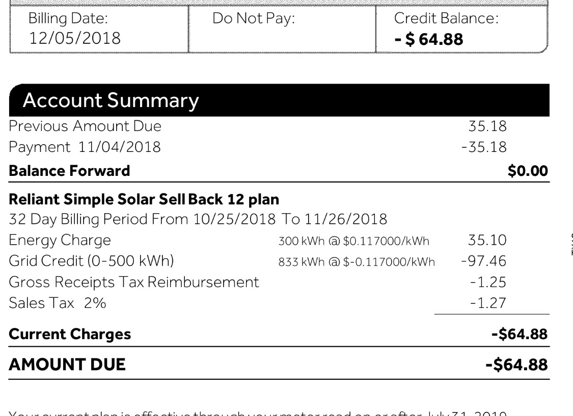 During these hot West Texas summers, when temps can reach triple digits every day for weeks and months on end, our central AC runs 24/7, and even then doesn’t keep the indoors at the temperature set.  It always struggles to keep up.  Our last electric bill before switching to the solar system, was over $500!!!  Ridiculous!  It is consistantly over $300, $400, $500, etc every month because of our 30 year old AC unit which is an energy hog.  We know we need a new HVAC system for this old house, but honestly, it would cost us more up front for the HVAC system, than it did for solar!  So we decided to do the solar first, and with the savings on our electric bill, we’d stash that away toward a new HVAC system in the future.  It just made sense. [Below are a couple of screen shots of our wintertime bills for Nov and Dec 2018, as an example.]