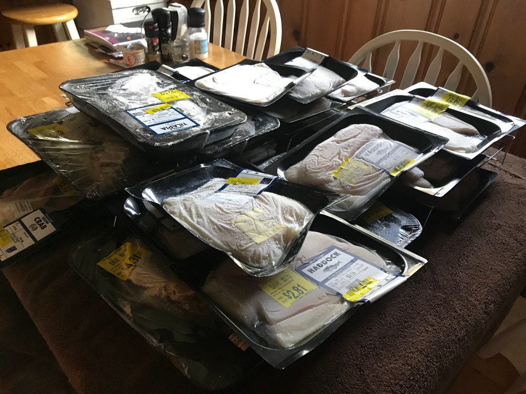 It seems like autumn is the season when preserving the harvest from land and sea is at full swing! Kitchens across the world at at their busiest, and ours is no exception. We are in the mountains and landlocked (not near an ocean), however, we were blessed with a huge donated load of wild caught whole tilapia and haddock filets. Our table was loaded with packages of this stuff. It was given to us frozen, so we laid it out on towels to thaw before processing.