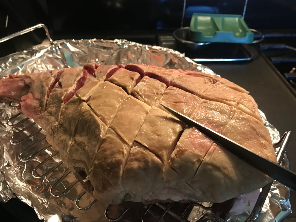 With a very sharp knife, score the fat side of the lamb in a criss-cross pattern (diamond shaped). Don’t cut too deep – you want the cuts to go just past the fat layer.